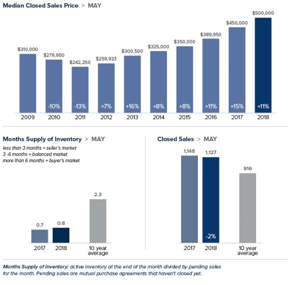 Last month brought some long-awaited, positive news for buyers with May posting the most new listings in over a decade. Despite the uptick in inventory, most homes are selling in less than a month. Prices haven’t been impacted either, with the majority of the region continuing to experience double-digit home price increases.