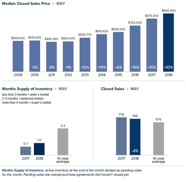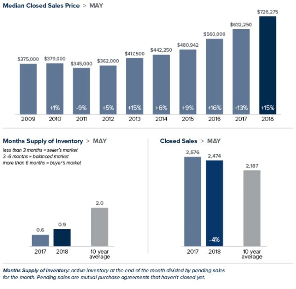 The median home price on the Eastside hit an all-time high of $960, 000 in May; a 10 percent gain over the same time last year. While there were a third more homes for sale in May than a year ago, the area still had only about a month of available inventory. Three to six months is considered a balanced market. Redmond, a city with a population of 64,000, currently has only 51 single-family homes on the market.